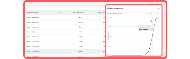 As you can see, along with the keywords, you’re gonna get historical data of each keyword. This means you can leverage this information to generate a full picture of product trends, adjust PPC campaigns, and optimize listings. Thus helping you redefine your strategy.