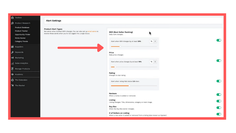 You can easily miss out on opportunities without proper alerts intact. But not on Jungle Scout’s watch, their alert feature keeps you informed about everything.